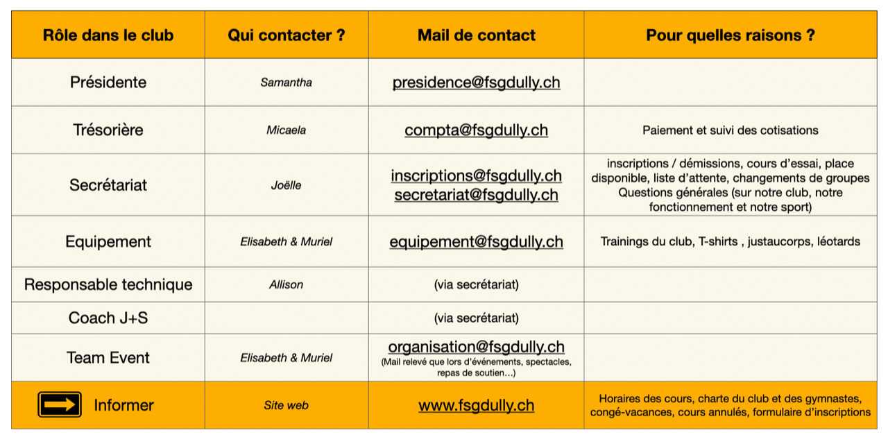 Afin de vous permettre de pouvoir vous adresser directement à la bonne personne du comité, voici un tableau qui regroupe les rôles dans le comité ainsi que les raisons qui pourraient vous mener à vous adresser à telle ou telle personne.